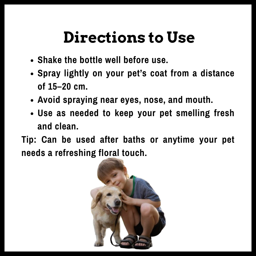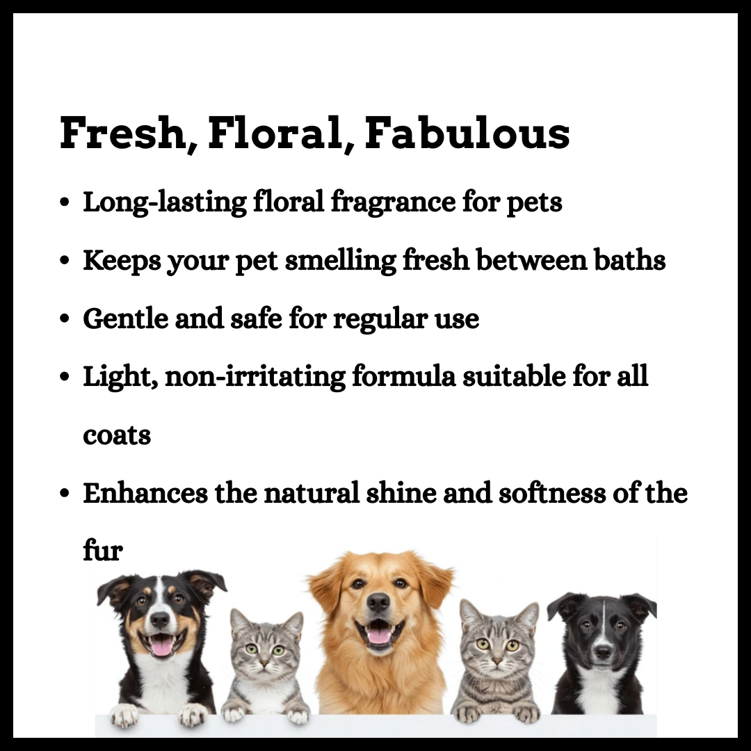 Velvet Fur Fragrance – Floral Perfume Treat your pet to a long-lasting floral fragrance that keeps them smelling fresh and delightful. Velvet Fur gently refreshes the coat while being safe and pet-friendly, leaving fur soft, shiny, and fragrant—perfect for daily use or special outings.