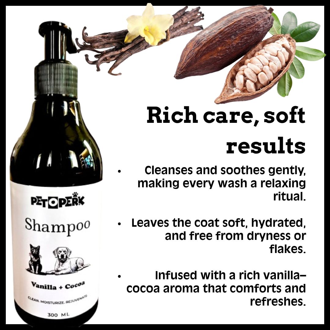 A warm, cozy scent paired with deep conditioning properties from cocoa butter. Ideal for pets with dry or rough fur, it nourishes from root to tip, leaving the coat silky and touchable. Perfect for snuggle lovers.