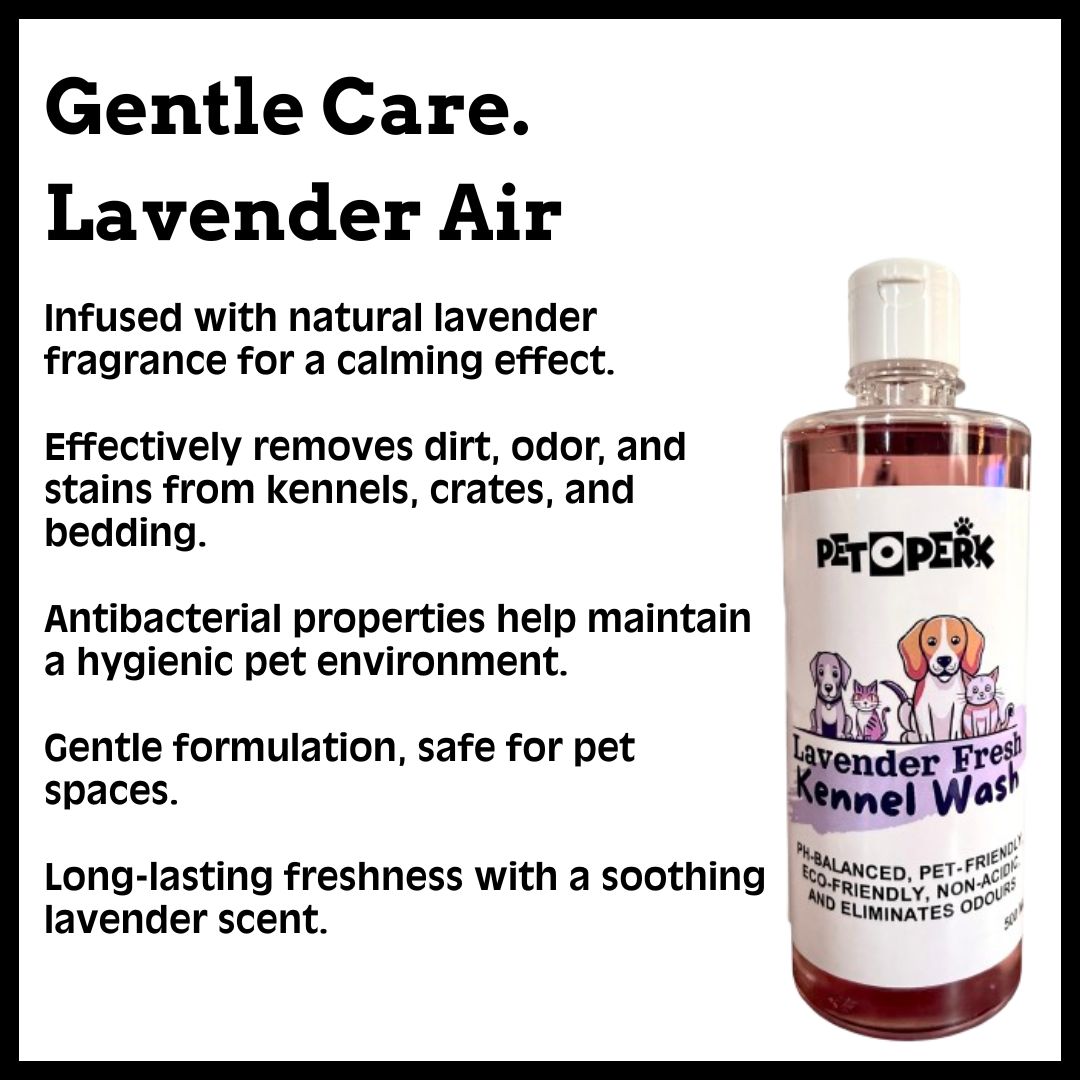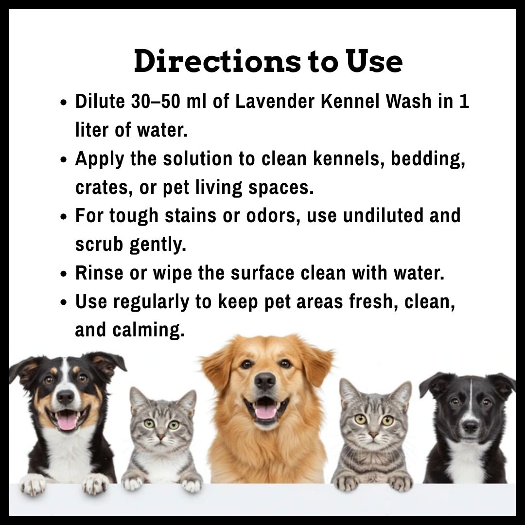 Infused with the calming scent of lavender, this wash deep cleans kennels and bedding zones, removing germs and odors while creating a relaxing environment for your pet.