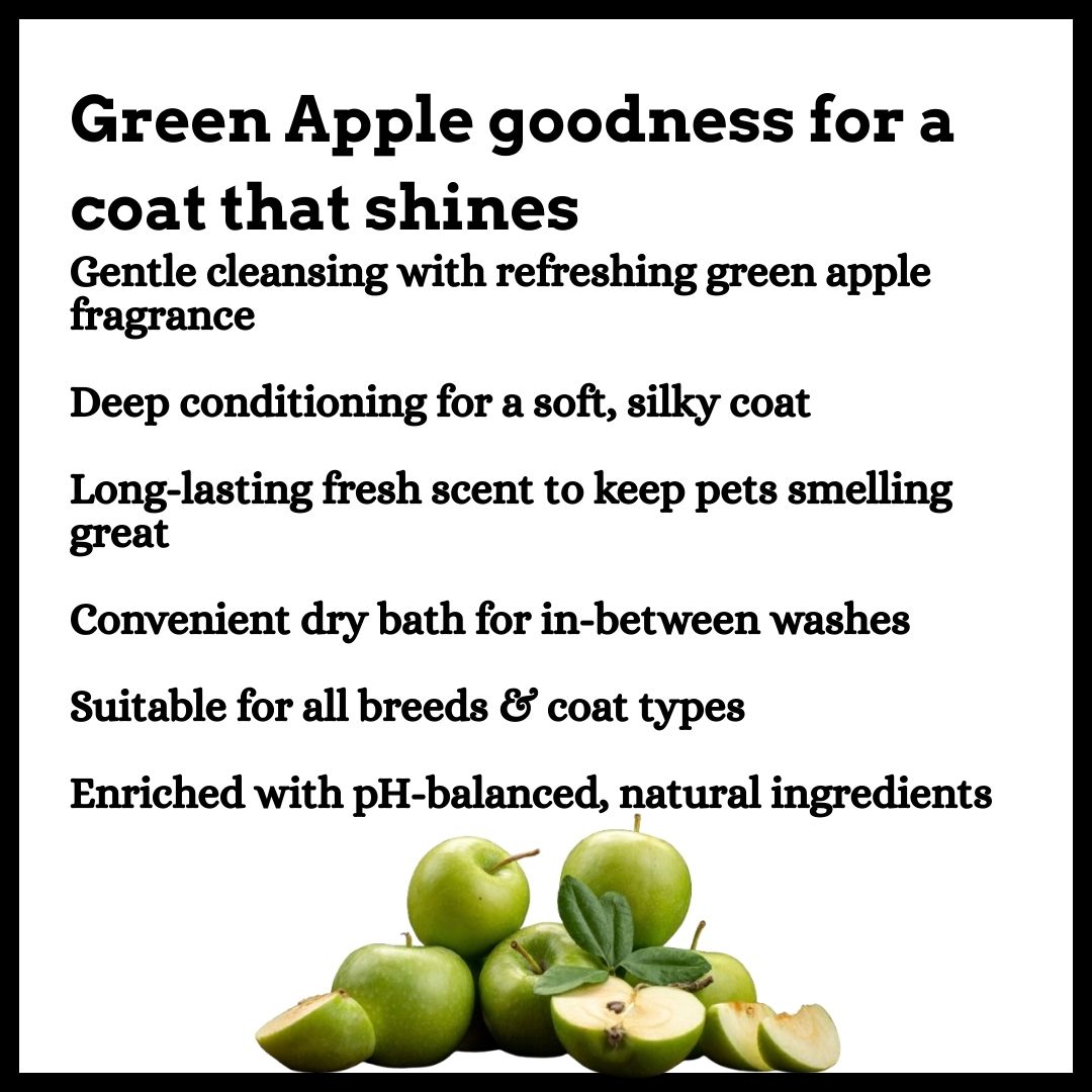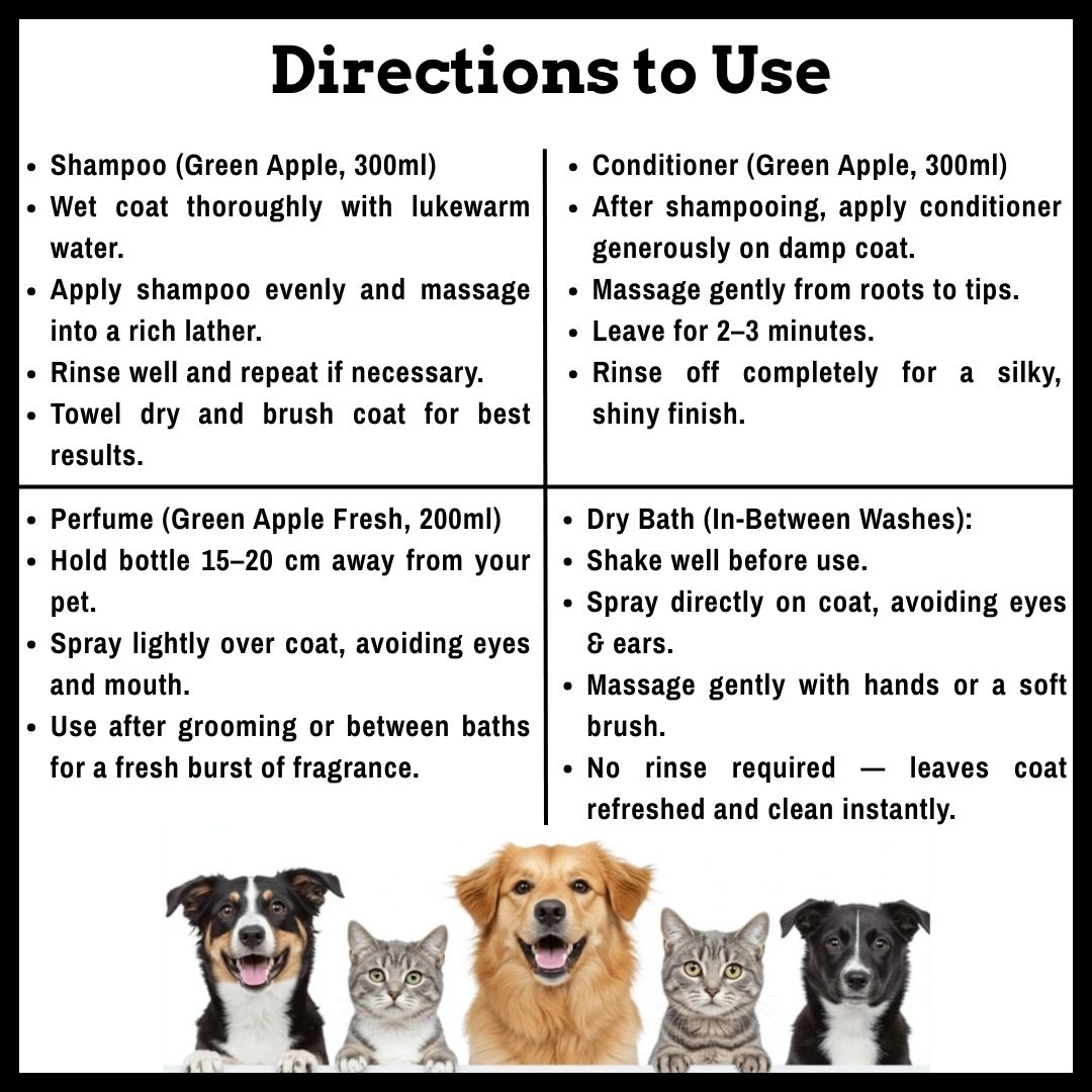 Fresh Care • Glossy Coat • Reviving Fragrance Give your furry companion a refreshing burst of Green Apple goodness. This combo is designed to cleanse, condition, and keep your pet smelling crisp and fruity in between washes—all while caring for sensitive skin. What’s Inside: Shampoo – Green Apple (100ml) – ₹199 Conditioner – Green Apple (100ml) – ₹199 Perfume – Green Apple (100ml) – ₹195 Dry Bath – Green Apple (110ml) – ₹179 Total Combo Value: ₹772 Why Pet Parents Love It: ✔ Gentle yet effective cleansing ✔ Deep conditioning & hydration ✔ Smooth, shiny coat with natural bounce ✔ Fresh, fruity fragrance that lingers ✔ Dry bath keeps pets fresh in between washes ✔ Suitable for all breeds & coat types Bring home the crisp freshness of Green Apple and make every cuddle moment irresistible.