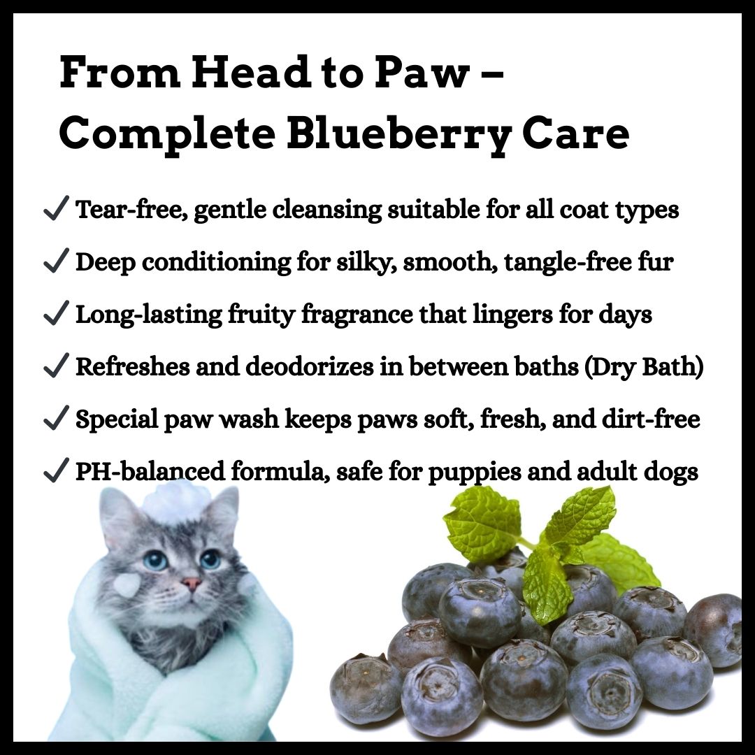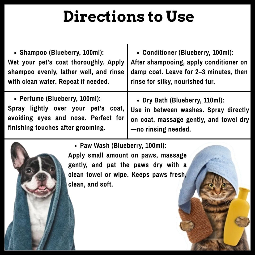 Nourish • Shine • Berry Freshness Give your furry friend the ultimate blueberry indulgence. This combo is carefully crafted to cleanse, condition, refresh, and leave your pet smelling deliciously fruity—all while being gentle on skin and coat. What’s Inside: Shampoo – Blueberry (300ml) – ₹480 Conditioner – Blueberry (300ml) – ₹480 Perfume – Blueberry Zest (200ml) – ₹375 Dry Bath – Blueberry (150ml) – ₹285 Paw Wash – Blueberry (150ml) – ₹290 Total Combo Value: ₹1,910 Why Pet Parents Love It: ✔ Deep cleansing that’s kind to skin ✔ Intense hydration & soft conditioning ✔ Smooth, glossy coat with natural bounce ✔ Long-lasting berry-fresh fragrance ✔ Dry bath keeps pets fresh in between washes ✔ Paw wash removes dirt & odor instantly ✔ Safe for all breeds & coat types Wrap your pet in the fruity freshness of blueberries—because every hug should smell as sweet as it feels.