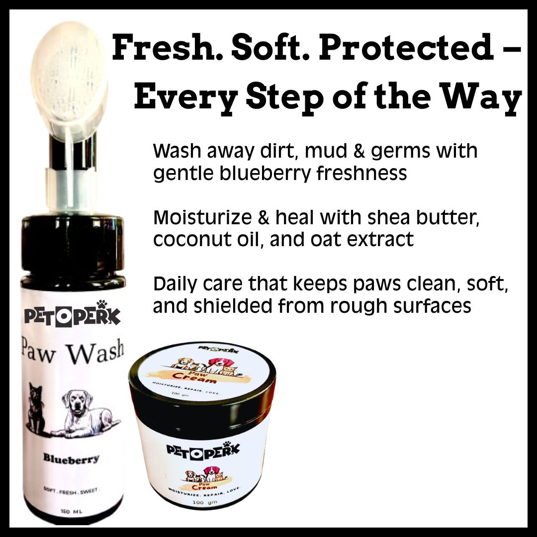 Cleanse • Protect • Berry Freshness Give your pet’s paws the gentle antioxidant-rich care they deserve. The Blueberry Paw Care Combo is designed to wash away dirt, soothe dryness, and keep those little paws soft, healthy, and cuddle-ready. What’s Inside: Paw Wash – Blueberry (150ml) – ₹290 Nourishing Paw Cream – Shea Butter & Natural Oils (100g) – ₹175 Total Combo Value: ₹465 Why Pet Parents Love It: ✔ Gentle, berry-fresh cleansing for paws ✔ Shea butter & coconut oil lock in moisture ✔ Beeswax creates a natural protective barrier ✔ Oat extract soothes dryness & irritation ✔ Keeps paws soft, healthy, and crack-free ✔ Safe & effective for daily use Wrap your pet’s paws in blueberry freshness and natural nourishment—because happy paws make happy walks.