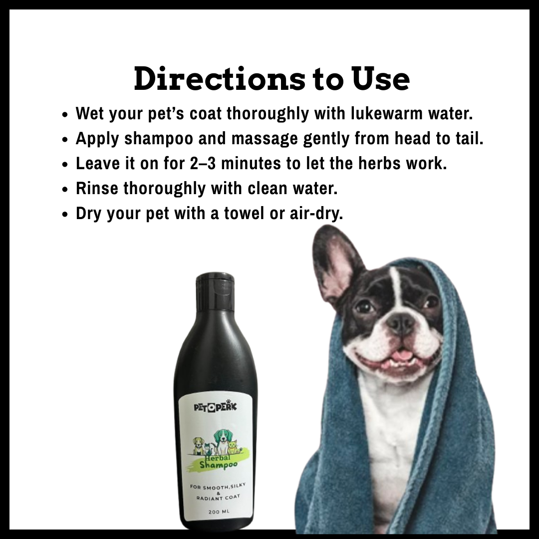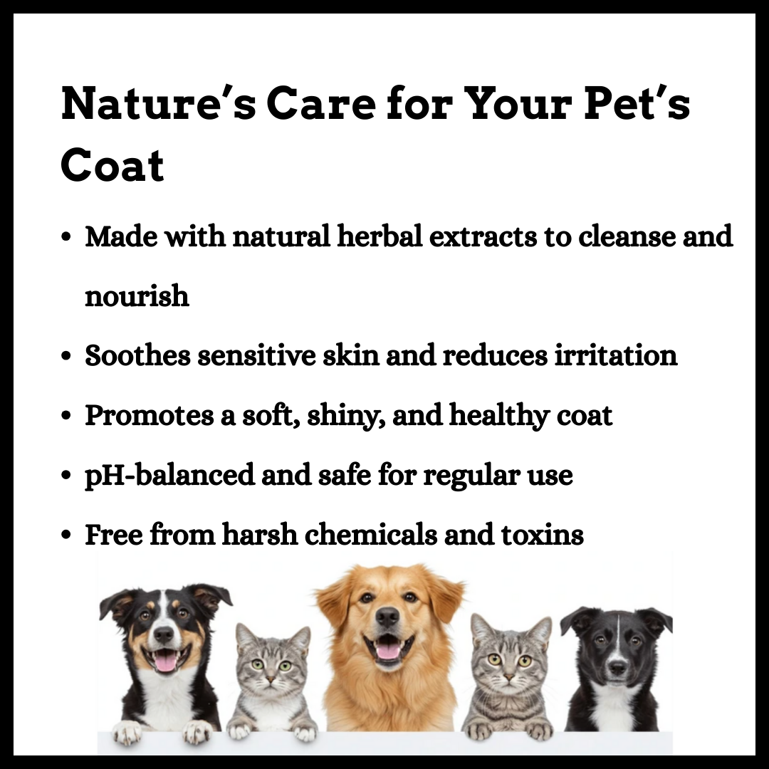 Herbal Pet Shampoo Give your pet a natural, gentle clean with our Herbal Shampoo, enriched with plant-based extracts to soothe the skin and nourish the coat. Perfect for regular use, it leaves fur soft, shiny, and healthy—without harsh chemicals.