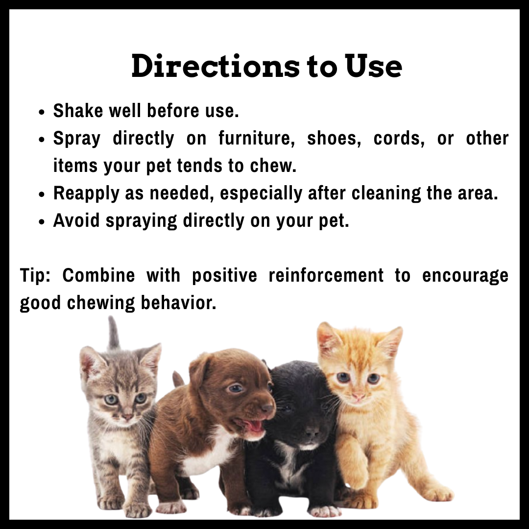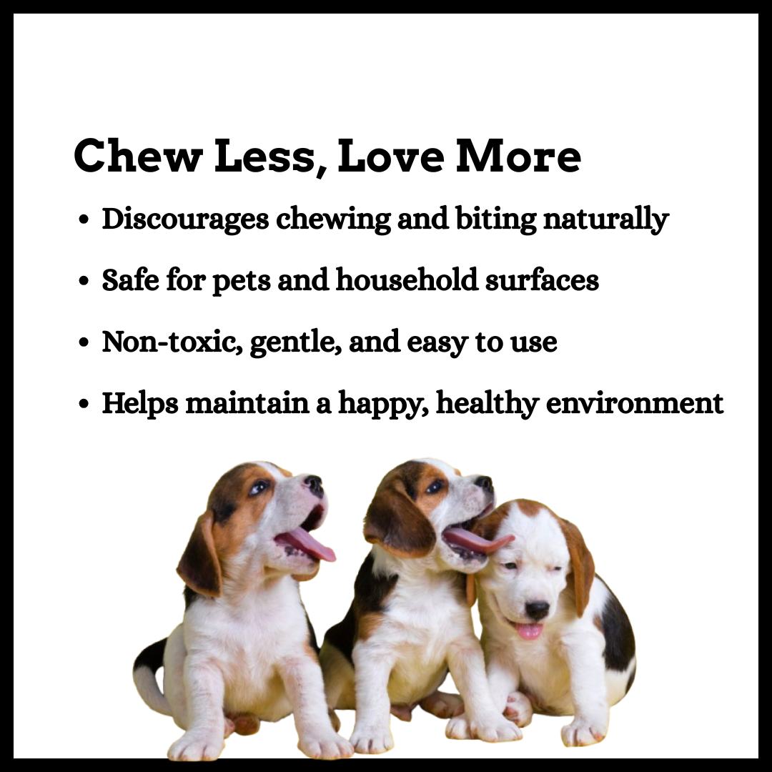 Anti-Chew Spray Protect your furniture, shoes, and belongings while keeping your pet safe with Pet O Perk’s Anti-Chew Spray. Made with a pet-safe, natural formula, it discourages chewing and biting without harming your furry friend. Gentle on surfaces and effective on all common household items, it’s the easy way to train your pet while maintaining harmony at home.