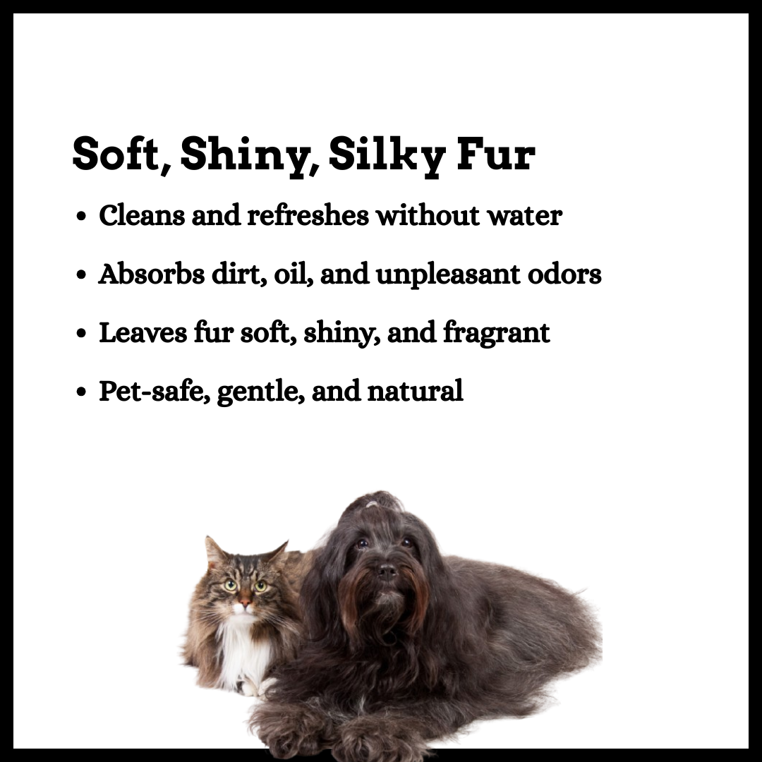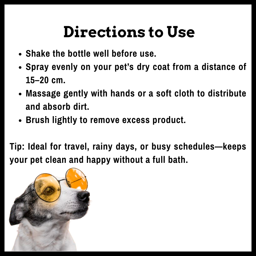 Herbal Dry Bath Keep your pet fresh and clean anytime, anywhere! Our Herbal Dry Bath is enriched with natural herbal extracts to absorb dirt, oil, and odor without water. Perfect for quick freshening between baths, it leaves fur soft, shiny, and lightly fragrant—safe and gentle for all pets.