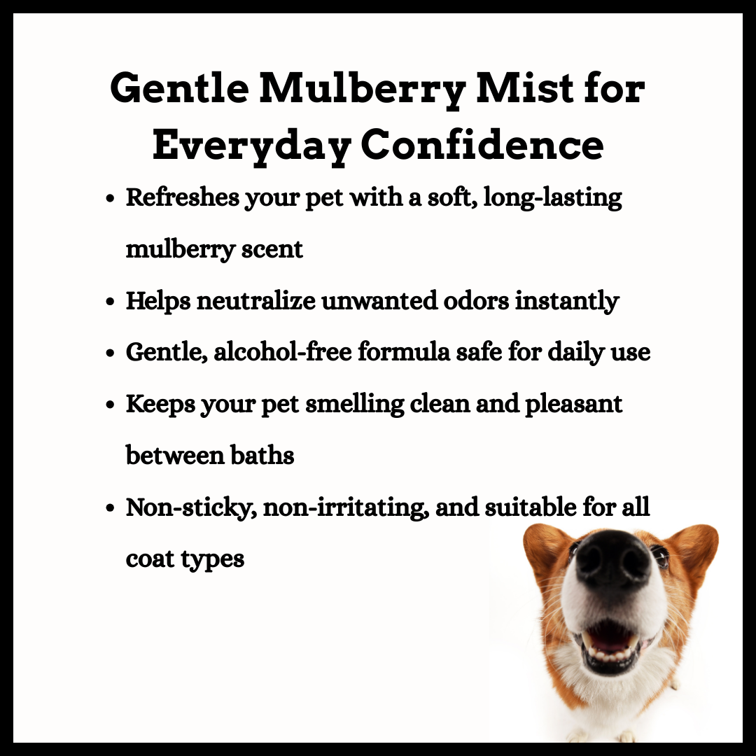 A soft, naturally sweet scent that keeps your pet feeling fresh without overwhelming their senses. The mulberry notes sit light on the coat and add a clean, comforting finish that lasts through the day.